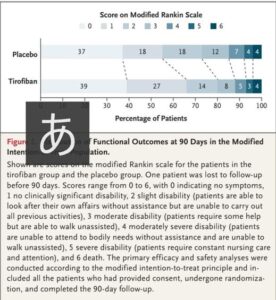 中国の38施設で実施されたASSET-IT試験の紹介です。発症4.5時間以内にt-PA静注療法を受け、血栓回収術適応外と判定された非心原性脳梗塞患者を対象に、血小板グリコプロテインIIb–IIIa受容体拮抗薬であるTilofiban(日本では未認可。24時間持続静注)をt-PA静注療法完了後60分以内に投与を行いプラセボ群と比較した試験です。