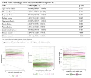炎症性脱髄疾患における脳萎縮は以前から重要なtopicの1つですが、MOGADにおいて脳容積が経時的に減少するのか、またMSやNMOSDとの相違点についてはよく分かっていませんでした。この論文では、MOGAD患者の脳MRIを定量的に評価し、MS・NMOSD・健常者との経時的変化を比較、さらに脳容積変化と臨床障害度との関連を検証しています。線形混合モデルを用いた結果、MOGADは健常者と比較して経時的な脳容積の減少を示しましたが、MSと比べて深部灰白質(視床・大脳基底核)は 相対的に保たれており、NMOSDと比較して上位頚髄の萎縮は緩やかでした。各病態の相違を反映して萎縮の様式に差が出たと考えられ、興味深い報告と考えます。MOGADやNMOSDにおいて真のsilent progressionが存在するのか、今後も注目していきたいです。