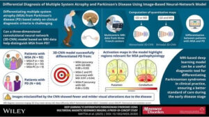 1.Deep Learning to Differentiate Parkinsonian Syndromes Using Multimodal Magnetic Resonance Imaging: A Proof-of-Concept Study Mattia, G. M., et al. Mov Disord. 2025 Oct;40(10):2139-2148. DOI: 10.1002/mds.30300 多系統萎縮症とパーキンソン病は、初期には臨床症状だけでは鑑別が難しいことが多く、画像やバイオマーカーを用いた客観的な診断支援が求められています。 本研究では、MRI画像(T1強調画像とDTI)をディープラーニングすることで、多系統萎縮症とパーキンソン病を正解率88%で区別することができました。 さらに、モデルの「どの部位を見ているか」を示すアクティベーションマップでは、多系統萎縮症の病態に関与する被殻や小脳が重要な領域として強調されておりました。 将来的には、日常診療で撮像されるMRIから、多系統萎縮症とパーキンソン病の早期鑑別をサポートするAIツールが実装されることが期待されます。(PDチームより)