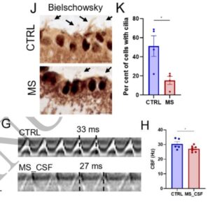 2.Cerebrospinal fluid-driven ependymal motile cilia defects are implicated in multiple sclerosis. Bigotte M et al. Brain (2025). 今月は多発性硬化症(MS)に関する文献の紹介です。MSの病態と上衣細胞の繊毛運動の関係は知られていませんでした。本論文では、single cell RNA解析と病理組織学的検討により、MS患者において上衣細胞の繊毛運動に関わる遺伝子およびタンパク質の発現異常が示されました。さらに、in vitroにおいて培養上衣細胞にMS患者の脳脊髄液(CSF)を添加したところ、繊毛の運動周期が延長(頻度の減少)し、同様の現象がIFNγ添加でも確認されました。繊毛機能を選択的に破壊(Ccdc39ノックアウト)するモデルを作成したところ、脳室の拡大、ミクログリアの活性化、巣作り行動の変化が見られました。MSでは、なぜCSFに接する部位で病変が生じるのか、新たな視点をもたらす画期的な研究であり、今後、MSにおいてCSFの炎症性サイトカインの除去や繊毛機能の改善が新たな治療薬のターゲットとして注目されるかもしれません。(神経免疫チーム)